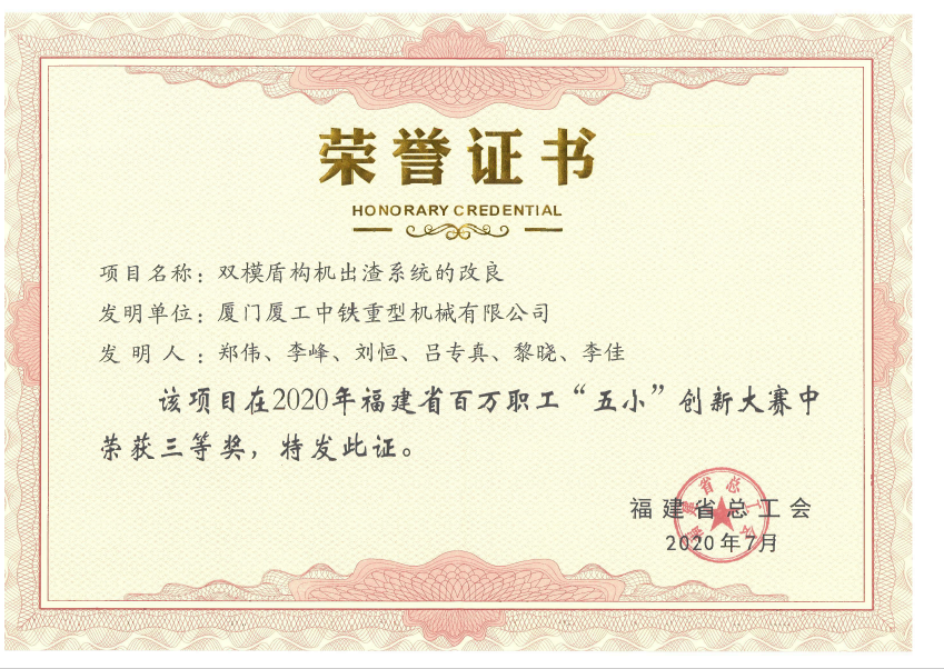 厦工中铁自2013年成立以来,秉持着“勇于跨越、追求卓越”的企业精神,不断进行技术创新和研究,拥有与隧道掘进机相关的核心专利35项,先后获得“厦门市智能制造试点示范企业”“厦门市科技进步奖二等奖”“福建省首台重大技术装备”“厦门市科技小巨人企业”等荣誉。